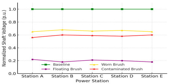 Normalized shaft voltage comparison across stations under different fault conditions.