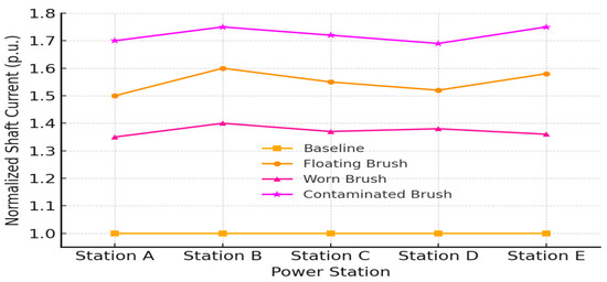Floating brushes caused severe current suppression in Station A and C confirming ineffective current dissipation as shown in Figure 27. Contamination brushes showed elevated or fluctuating current levels across most stations. Station E recorded consistently high normalized shaft current, indicating ongoing discharge through contaminated or degraded brush paths. Shaft current normalization is highly sensitive to floating current brush faults and is also valuable for diagnosing contamination-related discharge paths.