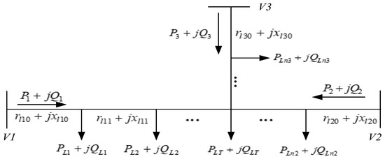 Figure 5 illustrates the presence of n load-only nodes situated between three measurement nodes: 1, 2, and 3. The power discharged from these measurement nodes is represented as P1 + jQ1, P2 + jQ2, and P3 + jQ3. Additionally, the average load per node is denoted as PL + jQL, with its calculation formula provided in Equations (31) and (32).