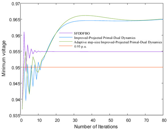 Scenario 1 represents heavily loaded network conditions under low PV output. Without PV reactive power regulation, the minimum network voltage drops to 0.937 p.u., accompanied by substantial network losses of 110.7 kW. The control strategy introduced in this paper successfully restores the minimum network voltage within acceptable range after 11 iterations. In contrast, the SFDDFBO algorithm demonstrates faster initial response, achieving voltage regulation within acceptable range after three iterations, while maintaining the maximum voltage levels consistently within acceptable range.