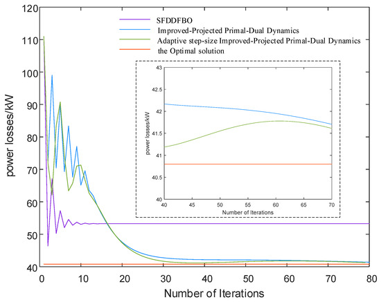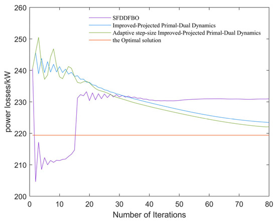 Figure 9 presents the comparative performance evaluation of the three distributed control methodologies in addressing voltage limit violations. It tracks the temporal evolution of maximum network voltage levels achieved by each control method throughout the iterative control process. The results demonstrate the dynamic response characteristics and convergence properties of each approach. Figure 10 provides a comprehensive assessment of the optimization capabilities. It presents a comparative analysis of network loss profiles generated by the two distributed control methods against the centralized control method.