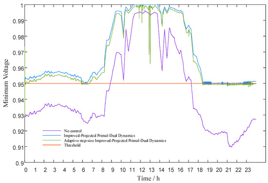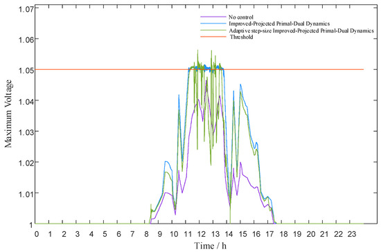 For the control algorithm introduced in this study, the initial control step size is set at 0.25, with acceleration factors b = 2 and c = 20 and step-size correction factors α = 1.005 and β = 0.85. We assume that each control operation consumes 0.5 s. Performance analysis is visualized in Figure 13, Figure 14 and Figure 15. Figure 13 and Figure 14 present comparative voltage profiles. These figures illustrate the maximum and minimum network voltages achieved under both the proposed control strategy and the baseline case without reactive power control. Figure 15 assesses the optimization efficiency of the distributed control method suggested in this paper versus centralized optimization control. It illustrates network loss curves produced by three scenarios: the distributed control method, no reactive power control, and centralized control method.