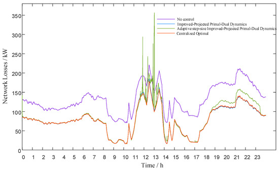 As illustrated in Figure 15, the reactive power control method introduced in this study significantly reduces network losses. This reduction is substantial compared to scenarios without reactive power control. When compared to centralized optimization results, the network loss profiles demonstrate remarkable agreement between the two methods. The proposed distributed reactive power control strategy incurs marginally higher losses than the centralized optimization method. However, this difference is negligible. This close alignment in performance validates the effectiveness of the distributed control strategy. It successfully approximates centralized optimization performance while maintaining the advantages of a decentralized architecture.