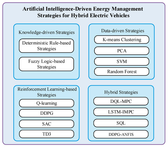In recent years, the rapid advancement of artificial intelligence (AI) technologies has provided new opportunities for breakthroughs in HEV energy management. With the increased computational power and widespread adoption of big data analytics, researchers have begun integrating AI algorithms into EMS frameworks, enabling environmental perception, autonomous learning, and intelligent decision-making—thus reducing the dependence on manual rules and predefined models [13]. In this context, this paper categorizes AI-driven EMS approaches into four types: knowledge-driven, data-driven, reinforcement learning-based, and hybrid strategies. Additionally, emerging AI technologies like deep learning and vehicle-to-vehicle communication are becoming central to modern EMS, providing enhanced adaptability and scalability in real-world conditions. These advancements mark a significant evolution in energy management, addressing the complex, dynamic scenarios encountered by modern HEVs.