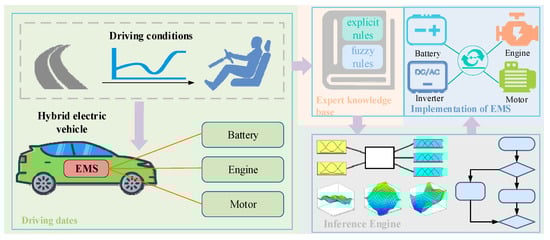 In the energy management of HEVs, knowledge-driven strategies primarily rely on engineering expertise and vehicle dynamics knowledge to establish control rules. These strategies do not require extensive data training, making them particularly suitable and robust in scenarios where system models are difficult to construct or where considerable uncertainties exist [38]. Such strategies typically collect driving condition inputs—such as road type and vehicle speed variations—alongside the operational states of key components including the battery, electric motor, and internal combustion engine. These inputs are processed by the EMS, which utilizes a rule base composed of deterministic and fuzzy logic rules. A reasoning engine then infers an optimal energy distribution plan, which is implemented by a controller to coordinate the operation of all power sources, thereby achieving intelligent energy regulation (as illustrated in Figure 3).