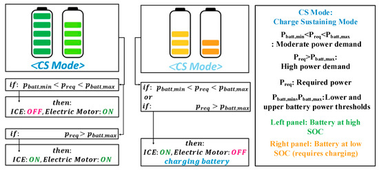 This category of strategy can be further divided into two main types: deterministic rule-based control and fuzzy logic control. Deterministic rule-based control, also known as logic threshold control, defines control logic by setting thresholds for key variables based on empirical knowledge. For instance, as shown in Figure 4, the engine’s start–stop behavior can be regulated by defining upper and lower bounds for the battery’s SOC. This approach was widely adopted in early HEV models—such as the SOC-hold strategy in the Toyota Prius—to balance energy consumption and power output. However, due to its tendency to cause abrupt control actions and result in poor system smoothness, its application is somewhat limited [39,40].