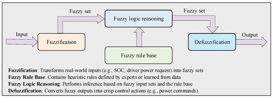 In contrast, fuzzy logic control is based on fuzzy set theory and aims to formalize expert knowledge to handle highly nonlinear systems. As shown in Figure 5, the typical fuzzy control process includes fuzzification, fuzzy inference, and defuzzification. Input variables are first transformed into linguistic variables (e.g., classifying SOC as “low,” “medium,” or “high”) and mapped through membership functions. Expert-defined IF–THEN rules are then applied for fuzzy inference—commonly using the Mamdani method, which determines the rule activation strength via the minimum operator and aggregates outputs via the maximum operator. Finally, defuzzification techniques such as the centroid method are used to derive concrete control commands [41,42].