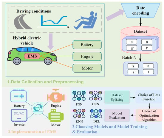 Finally, hybrid strategies aim to draw on the strengths of all the above to create more balanced systems. In many hybrid EMS frameworks, conventional rule-based or model-driven strategies handle higher-level decision-making to maintain safety and ensure performance, while AI-driven algorithms are tasked with fine-tuning the power distribution in real time. This setup allows for both global optimization and real-time responsiveness [32]. Some hybrid approaches take it a step further by using AI to improve existing rule-based systems—for example, optimizing fuzzy logic rules with genetic algorithms or deep learning techniques—or by embedding expert insights into learning algorithms to speed up convergence [33]. By combining the reliability of knowledge-driven methods with the adaptability of data-driven ones, hybrid strategies manage to achieve a more robust and versatile performance profile.