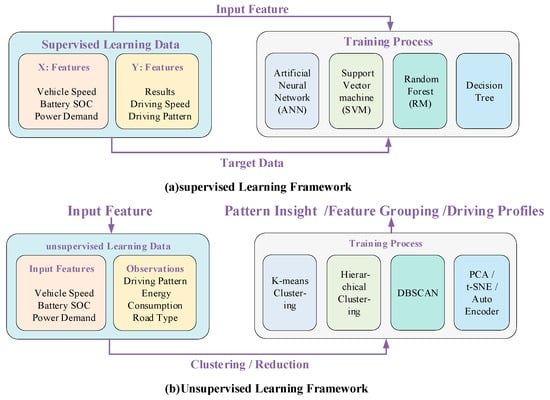 With the rapid development of artificial intelligence, data-driven strategies have become a central tool in energy management for HEVs. Unlike knowledge-driven approaches that rely on human expertise, data-driven methods—illustrated in Figure 6—leverage real-world driving data such as vehicle speed and road conditions to establish mappings between input features and optimal energy allocation strategies using supervised or unsupervised learning. This enables intelligent energy coordination and significantly enhances vehicle performance and energy efficiency [13]. As shown in Figure 7, these strategies can be broadly categorized into supervised and unsupervised learning approaches. By deeply modeling the vehicle and environmental states, data-driven methods drive energy allocation toward optimality and improve the synergy between fuel and electric power usage [44].
