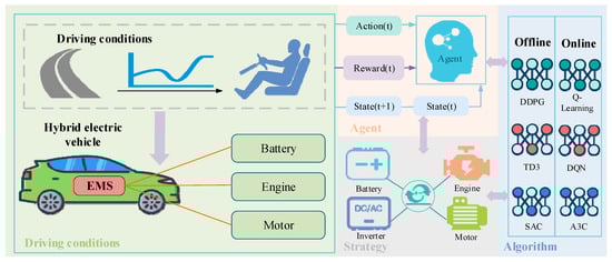 Reinforcement learning, as a subset of data-driven methods, focuses on learning by interacting with the environment. EMS is reframed here as a sequential decision-making problem, tackled by agents—often employing deep reinforcement learning—that iteratively refine their control strategies to maximize long-term benefits like improved fuel efficiency or reduced emissions [30]. These methods do not rely on precise system models, which allows them to adapt in real time to a wide array of driving situations. However, issues such as stability during training, the speed of convergence, and safety during exploration still pose significant challenges [31].