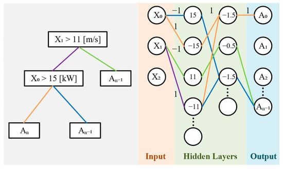 Mapping from expert decision tree to FlexNet (left: decision tree; and right: FlexNet neural network).