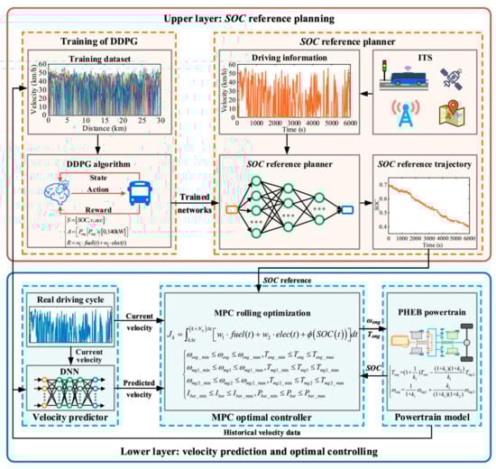 - He, H.; Huang, R.; Meng, X.; Zhao, X.; Wang, Y.; Li, M. A Novel Hierarchical Predictive Energy Management Strategy for Plug-in Hybrid Electric Bus Combined with Deep Deterministic Policy Gradient. J. Energy Storage 2022, 52, 104787. [Google Scholar] [CrossRef]