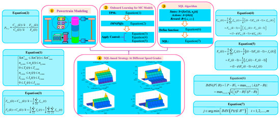 The second category embeds real-time optimization within a learning-based control framework. Model Predictive Control (MPC) is capable of dynamic optimization over short time horizons but incurs a high computational cost. To address this, Chen et al. [69]. proposed a strategy combining Q-Learning with MPC, as shown in Figure 13. A Q-table is trained offline and subsequently used in MPC’s rolling horizon optimization to assist value evaluation, effectively reducing the computational load and enhancing the energy efficiency [66]. Shen et al. further incorporated Double Delayed Q-Learning (DDQL) and vehicle speed predictions via Convolutional Neural Networks (CNNs) to develop a more adaptive MPC control structure [70].