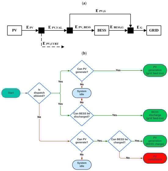 Schematics of the energy flows and operating logic are shown in Figure 1a and Figure 1b, respectively. Depending on the curtailment scenario and related dispatch limitations, PV production is either fully or partially fed to the grid (EPV,G). In the latter case, otherwise curtailed PV production is directed to the BESS for charging (EPV,BESS) until the battery charge limit is reached. Once this limit is achieved, any surplus PV production is curtailed (EPV,CURT). According to Jones-Albertus et al. [28], the sum of EPV,G and EPV,BESS is referred to as valuable photovoltaic electricity (EPV,VAL). The stored energy is fed into the grid (EBESS,G) when dispatch is allowed, simultaneously with EPV,G. Allowing simultaneous feed-in from both the PV system and the BESS represents a strategic approach for the effective use of the BESS, especially during morning and evening hours. Indeed, during these periods, the residual load (excluding VRES) is typically high. Therefore, discharging the battery while feeding in PV energy enhances system support and grid stability.