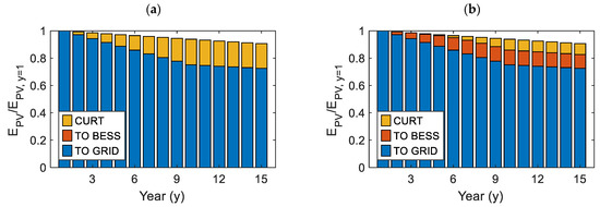 For better clarity, Figure 4 shows the distribution of curtailed and valuable PV generation over the system lifetime when CURTMAX reaches 20% in 10 years (UL profile), for HBESS = 0 h (a) and HBESS = 0.67 h (b). As can be seen, the total producibility (EPV) of the system (sum of blue, orange, and yellow bars) decreases over time due to the degradation of the PV modules. Additionally, the CURTMAX level of 20% is reached by the 10th year. Clearly, the presence of the BESS allows the minimization of the curtailment of EPV (Figure 4b).