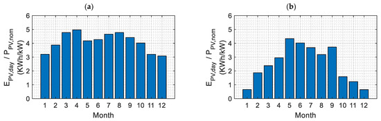 Average daily PV generation per month in (a) Cagliari, Italy, and (b) Berlin, Germany.