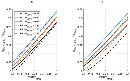 Curtailment of PV generation as function of CURTMAX and HBESS for (a) Cagliari, Italy, and (b) Berlin, Germany. Upper limit (UL) and proportional (PR) profiles of hourly curtailment.