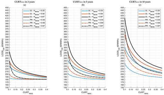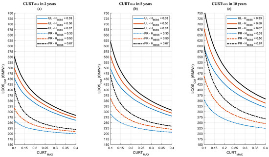 Figure 7 and Figure 8 report the LCOSCM for the two locations and the different curtailment scenarios as functions of CURTMAX and for storage capacities (HBESS) of 0.33, 0.50, and 0.67 h. In particular, Figure 7a–c refer to Cagliari, Italy, and Figure 8a–c to Berlin, Germany. For each location, Figure 7 and Figure 8 show the LCOSCM for the short-term horizon (2 years), the medium-term horizon (5 years), and the long-term horizon (10 years). The LCOSCM values obtained considering the upper limit (UL) profile of hourly curtailment are represented with solid lines, while dashed lines represent the proportional (PR) hourly curtailment profile.