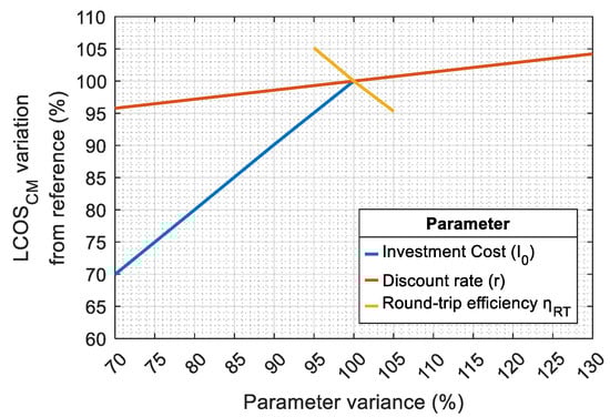 To assess the impact of key techno-economic parameters on LCOSCM, Figure 9 presents the results of a sensitivity analysis, where the investment cost (I0), discount rate (r), and round-trip efficiency (ηRT) are varied. In more detail, ηRT is varied within ±5% of its reference value (0.90), the discount rate from 70% to 130% of its baseline value (2.5%), and the investment cost (I0) is varied only in the downward direction, from its baseline value (500 EUR/kWh) to 70% (350 EUR/kWh), in line with the cost projections by the Fraunhofer Institute, which estimates a 30% reduction by 2035 [32].