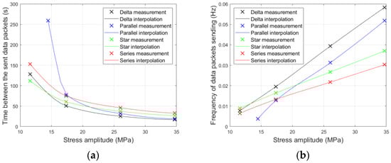 For stress amplitudes above 15 MPa and all of the rotation speeds of the shaft, an application of a delta connection of MFC patches enabled achieve a shortest time between the sent data packets. Below 15 MPa, the star connection of MFC patches enabled the shortest time between the sent data packets.