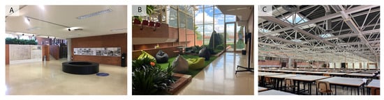 Figure 3A,B. The School of Architecture offers a teaching and service program that covers spaces of different surfaces, heights, and uses. The monitoring system had to adapt to this heterogeneity of geometries and occupations.