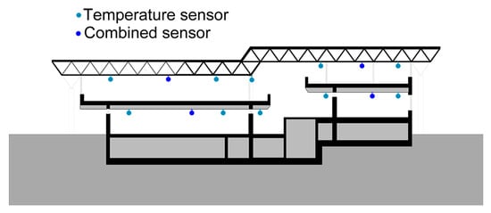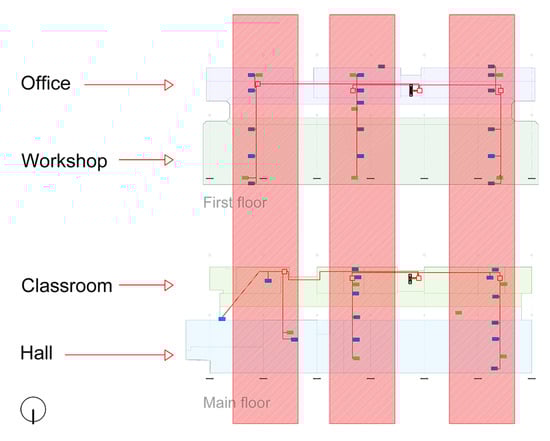 The building’s sensor array was divided into three distinct zones based on identifying spatial characteristics and the limited number of installable sensors. Based on the east–west orientation, three north–south axes, were integrated, as illustrated in