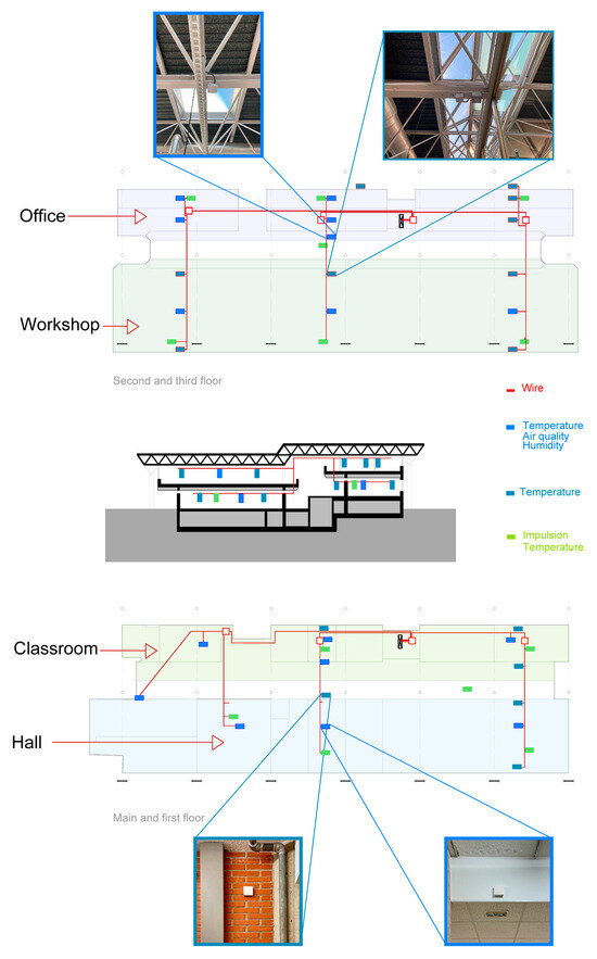 The object of the measures is to periodically collect temperature, humidity, and CO2 information from two opposite thermal areas and the middle one, as will be explained later. Consequently, these measures can reveal the thermal response characteristics of individual rooms and the overall building, with HVAC operational schedules and temperature setpoints serving as reference baselines.