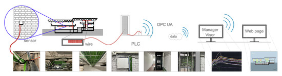 Figure 8 shows the units comprising the entire monitoring system described in this building section. This helps to understand the system’s complexity, as each decision affects its neighboring units. At the bottom of the image, photos and screenshots of the installation, from the sensor cable to the public viewer, are included.