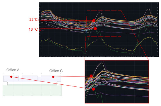 After a comprehensive preliminary study, existing buildings should have a sensor model installed. This research demonstrates the effectiveness of this approach, where monitoring-based management can lead to optimized energy use and enhanced environmental performance. This can help assess a building’s acceptable comfort parameters without receiving user complaints. Building temperature fluctuations tend to be periodic and predictable. By identifying them, palliative measures can also be implemented in similar cases.