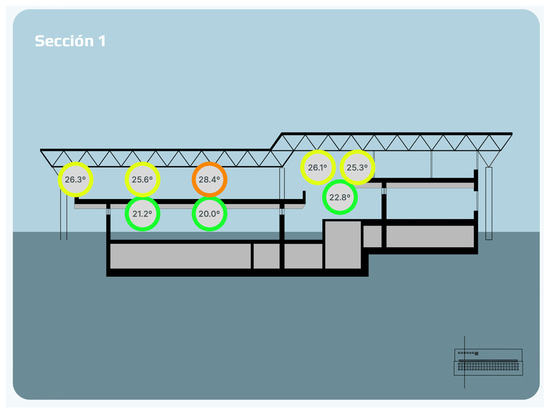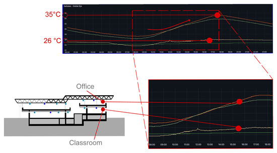 Figure 10. Since this effect had not been quantified before, users identified discomfort due to heat, and the heating was turned off following complaints during the winter. The upper floor is not heated on sunny days anymore. An extended period is necessary to evaluate the energetic impact throughout the year. Nevertheless, it is considered that buildings equipped with lightweight roofing systems require the installation of specific thermal sensors for temperature control due to the effects of direct solar radiation. This preventive measure aims to prevent users from being exposed to extreme thermal conditions, particularly during periods of maximum solar incidence. The low thermal inertia characteristic of lightweight roofs generates more pronounced thermal fluctuations and rapid responses to solar radiation variations, requiring more sensitive and reactive thermal monitoring and control systems to ensure occupant well-being.