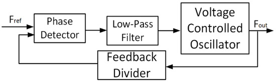 A phase-locked loop (PLL) is a closed-loop feedback-based control system that generates a signal of the same frequency as its input signal. This is performed by locking and continuously adjusting its phase difference to the reference signal [35]. The PLL circuit is composed of three parts: (1) a phase detector that measures the phase difference between two periodic signals, (2) a low-pass filter that translates the phase difference into a feedback signal, and (3) a voltage-controlled oscillator (VCO) whose frequency is adjustable by the feedback signal and subsequently generates the output signal. The negative feedback loop keeps the output at the same frequency as the input signal by monitoring the phase difference between the input signal and the signal generated by the VCO. Based on this monitoring, the output frequency is modified to align with the phase difference, thereby ensuring the stability and consistency of the output [36]. The block diagram for a PLL configuration is illustrated in Figure 1.
