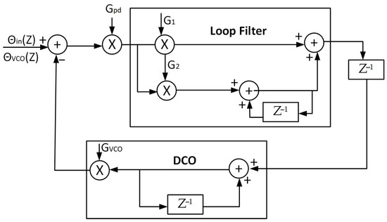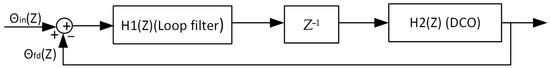 The transfer function of the loop filter, the digital controller oscillator (DCO), and the closed loop of the digital PLL are given, respectively, by Equations (18)–(20).
