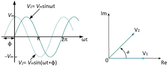 A phasor is defined as a rotating vector that represents a sinusoidal quantity, such as an AC signal. The concept may also be delineated as a vector comprising magnitude and angle, corresponding to a sinusoidal waveform, as illustrated in Figure 5. The subject is frequently posited as a complex number, accompanied by phase and amplitude [14,16].