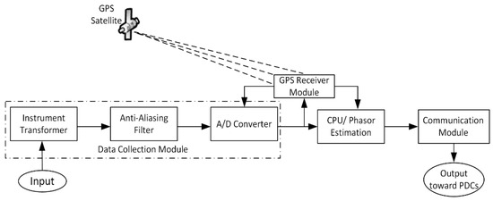 PMUs collect analog measurements from the secondary windings of instrument transformers (CTs and PTs). The data are transmitted to the local phasor data concentrators (PDCs) via an anti-aliasing filter, which serves to eliminate the signal with a frequency that exceeds or equals one-half of the sample rate, also referred to as the Nyquist frequency. This process effectively restricts the analog signal bandwidth to the necessary level [13,14]. To obtain the desired digital signal, data are conveyed through the analog-to-digital (A/D) converter to be discretized. The resulting digital signal is then transmitted to the central processing unit (CPU), where mathematical computation of its magnitude and phase takes place. At this level, data time synchronization by a sampling clock occurs with the signal received from the GPS receiver [43,44]. The PMU constituent modules are illustrated in a block diagram of Figure 6.