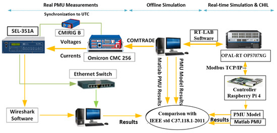 Referring to the performance requirements of the IEEE standard C37.118.1-2011 [40] related to the use and functionalities of the PMUs, considering Fourier transforms and phase-locked loop (PLL) techniques, a P-class PMU is modeled, implemented and simulated in MATLAB/Simulink R2021b and the real-time simulator OPAL-RT OP5707XG. For validation, the offline and real-time simulation measurement results from the proposed PMU model are compared to the measurement results of the real PMU laboratory tests and the PMU performance requirements outlined in the IEEE standard C37.118.1-2011 and C37.118.1a-2014 [40,41]