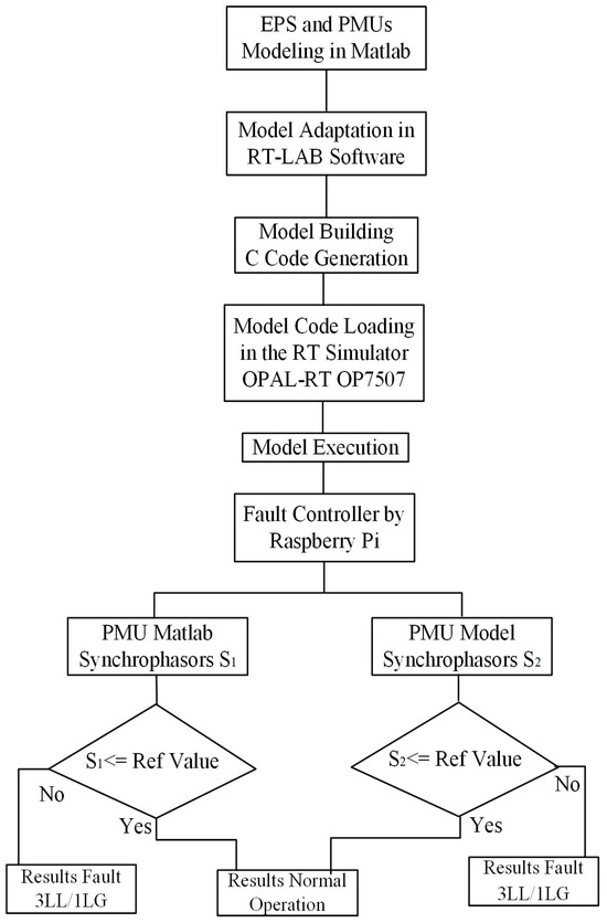 The OPAL RT-LAB 2022.1 software adapts the EPS model, which is then built, loaded, and executed in the OPAL-RT OP5707XG simulator as C code. The controller hardware-in-the-loop (CHIL) technique enables the interaction between the system model and the real controller in Raspberry Pi 4, using the Modbus TCP/IP protocol for communication with the real-time simulator. This technique was used to control the fault occurrence by determining the adding and removal time of faults during the PMU-monitored EPS test process. For faulty operations, a symmetrical fault with a three-phase line-to-line (3LL) short-circuit and an unsymmetrical fault with a single line-to-ground (1LG) short-circuit in phase A are considered.