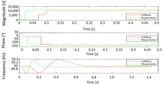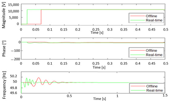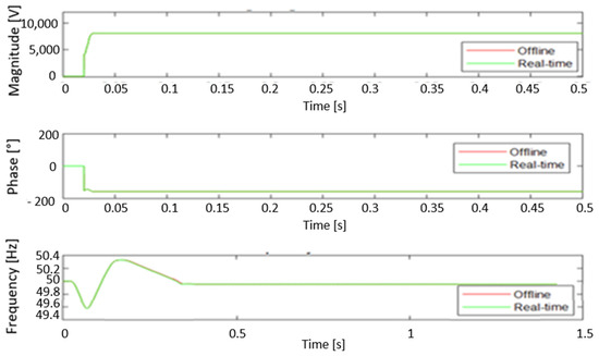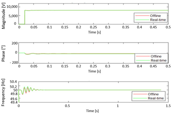 The analysis revealed that the maximum measuring errors were −2.11% and −2.24% for voltage and current amplitudes, respectively, and 0° (0%) for the phase angle. The IEEE standard C37.118.1-2011 [40] tolerance is ±10% for amplitudes and ±10° for phase angle. The frequency error (FE) registered at 0.002 Hz, whereas the admissible frequency error tolerance as delineated by the IEEE standard is 0.005 Hz. The total vector error (TVE) ranges from 0.0397% to 0.041% across various phases in both offline and real-time simulations. It is important to note that the TVE standard admissible tolerance is set at 1%. Consequently, the proposed PMU model is in accordance with the requirements stipulated in the IEEE C37.118.1-2011 standard [40] and its amended version C37.118.1a-2014 [41].