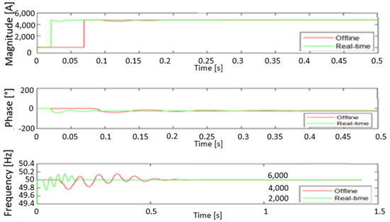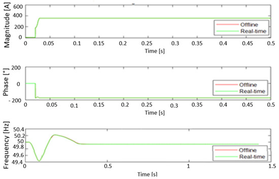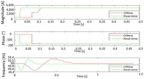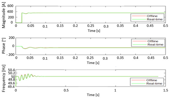 The graphical representations of the current synchrophasors in Figure 20 and Figure 21, measured by both PMUs indicate that real-time and offline simulations produce approximately the same waveforms during the transient period at the beginning of the process as well as within the steady-state operation. Both PMUs (the Matlab PMU bloc and the proposed model) were found to be suitable for such a measurement. The low current measurements were observed due to power losses resulting from the harmonic presence.