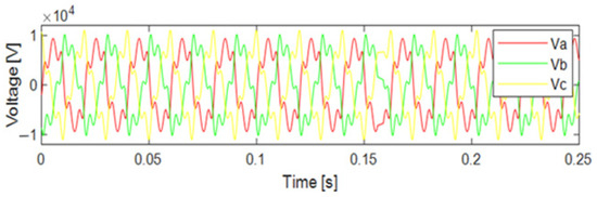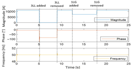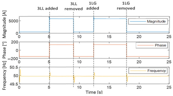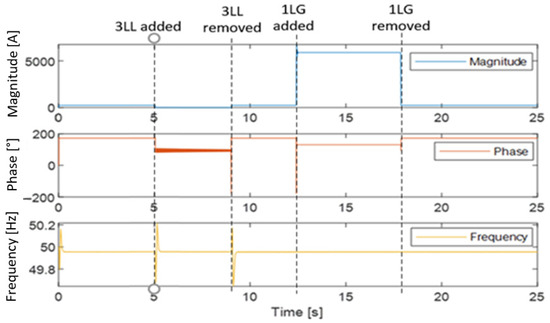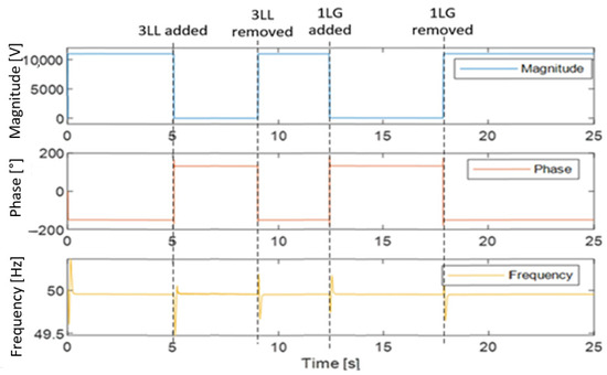 The proposed PMU model accurately measures the system synchrophasors under symmetrical and non-symmetrical faults (3LL and 1LG), where their occurrences result in the voltage passing to the lowest values (approximately zero) and the current reaching very high values around ten times the normal load current, corresponding to the fault currents as discussed above. However, it should be noted that the Matlab PMU block suitably measures the system’s synchrophasors exclusively under symmetrical faults, in which case neither negative nor zero sequences are available. This PMU block is unable to effectively process the measurements under unsymmetrical faults where all symmetrical components are present. This is illustrated in Figure 25, where the PMU block fully measures the symmetrical fault as the voltage drops to its lowest and negligible level. However, the unsymmetrical fault is not accurately measured due to the presence of negative and zero sequence components that the PMU block in question does not detect.