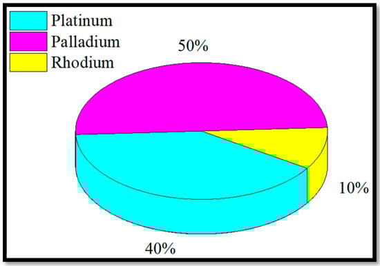 The after treatment process uses techniques like exhaust gas recirculation (EGR), diesel oxidation catalyze (DOC), diesel particulate filters (DPFs), catalytic converters (CCs), selective catalytic reduction (SCR), lean NOx traps (LNT), non-selective catalytic reduction (NSCR), and scrubbers to turn harmful exhaust gases into harmless gases. Platinum group metals (PGMs) include platinum, palladium, rhodium, osmium, iridium, and ruthenium, which are utilized extensively in high-tech applications. As a result of their high corrosion and oxidation resistance, excellent thermal conductivity, and outstanding catalytic activity, these metals are indispensable in many advanced technologies. In the automotive sector, components such as DOC, DPFs, CCs, SCR systems, NSCR systems, and scrubbers rely on PGMs for their functionalities [6]. Automotive catalysts represent the richest and most widely exploited secondary sources of PGMs. Light-duty vehicles (LDVs) typically use catalysts containing 1–3 g of PGMs, while heavy-duty vehicles (HDVs) utilize 12–15 g per catalyst, as shown in Figure 1. A catalyst plays an important role in reducing PM (particulate matter), NOx, and HC emissions. The exceptional catalytic properties and high-temperature resistance of PGMs are central to their effectiveness in mitigating vehicular emissions [7].