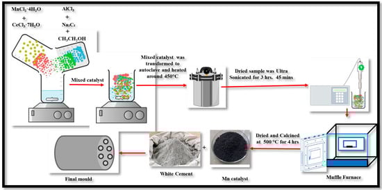 The synthesis process for the Mn catalyst-based mold, illustrated in Figure 2, is adapted from previous studies [13,14,15] to ensure its suitability for combustion-related applications. The procedure begins with the preparation of reactants, where 18 g of MnCl2 and 34 g of CeCl3 were accurately measured, then the molar ratio of Mn:Ce ≈ 1:2 was obtained, and it was introduced into a reaction vessel. To this, 15 g of sodium carbide and AlCl2 were added. Ethanol, in a volume of 250 mL, was utilized as the reaction medium to facilitate homogenization of the mixture. The homogenized mixture underwent high-temperature processing in an autoclave at 450 °C, allowing it to interact under controlled thermal conditions. Then, the solution was subjected to an ultrasonication process for 3.45 h to enhance particle dispersion and promote uniform interactions. Subsequently, the ultrasonicated solution was agitated using a magnetic stirrer set at 250 rpm to ensure thorough mixing. Once the stirring process was completed, the solution was dried, and the Mn catalyst was obtained in its purified form. It underwent calcination in a temperature range of 450 to 550 °C and for 3–4 h. The catalyst was then shaped using a binder material, with plaster as supporting material to achieve the final mold structure.