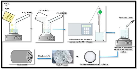 The synthesis process for the Ce-Si catalyst-based mold, illustrated in Figure 3, followed a systematic procedure utilizing the sol-gel method. Cerium (III) chloride (CeCl3) at the required quantity was dissolved in a mixture of water and ethanol, and its molar ratio was 1:1. This solution was stirred thoroughly to ensure the complete dissolution of CeCl3 and set aside for subsequent use. Simultaneously, tetraethyl orthosilicate was prepared by mixing tetraethyl orthosilicate (TEOS) with ethanol in a separate container. The mixture was stirred until a clear and homogeneous silica precursor solution was obtained [16].