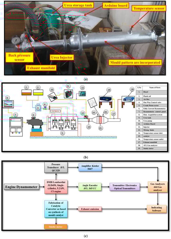 This investigation utilized a Kirloskar single-cylinder, four-stroke, IC engine rated at 5.2 kW. An eddy current dynamometer was employed to evaluate the engine’s performance under varying load conditions. The schematic layout of the research engine is depicted in Figure 4a, and the real-time engine setup is shown in Figure 4b,c. The detailed technical specifications of the engine are provided [10,17,18,19]. The engine was equipped with advanced instrumentation, including pressure transducers, thermocouples, mass flow sensors, and throttle position sensors, enabling a comprehensive analysis of combustion, performance, and emission characteristics. A data acquisition system (DAS) was integrated into the setup to record in-cylinder pressure profiles and facilitate real-time monitoring and control. Pressure sensors installed within the combustion chamber provided precise data on in-cylinder pressure dynamics, which were processed via the DAS [11,20,21]. Exhaust gas emissions were quantified using an AVL five-gas analyzer, enabling the measurement of critical emission parameters, including CO, carbon dioxide (CO2), NO, HC, and O2 concentrations engine measurement and specification details are shown in Table 3. A resistance thermometer was employed for precise monitoring of water temperature, while K-type thermocouples were strategically positioned at various locations within the cylinder chamber to capture localized thermal gradients. Additionally, the tailpipe emissions were analyzed to assess overall engine emission characteristics [22,23]. Six experimental trials were conducted to justify the impact of catalysts and fuel on exhaust gas emission analysis in the stationary diesel engine: T1: Engine utilizing diesel fuel; T2: Engine utilizing DPB fuel; T3: Engine utilizing diesel fuel and Mn-based mold; T4: Engine utilizing DPB fuel and Mn-based mold; T5: Engine utilizing diesel fuel and Ce-Si-based mold; and T6: Engine utilizing DPB fuel and Ce-Si-based mold.