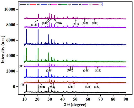 The XRD analysis of the Mn- and Ce-Si-based molds was performed over the range of 2θ = 10–90°, and the resulting diffraction patterns are presented in Figure 6. Accentuated peaks pronounced at angles of 2θ = 28.55°, 33.58°, 47.79°, 56.47°, and 58.72° were indexable to the (111), (200), (220), (311), and (222) planes, respectively, confirming fluorite cubic phase structure for CeO2. Overall, the broadness and limited intensity of these peaks indicate a lower crystallinity, which is almost always extremely desirable in order to improve catalytic reactivity due to an increased amount of surface defects and active sites [30].