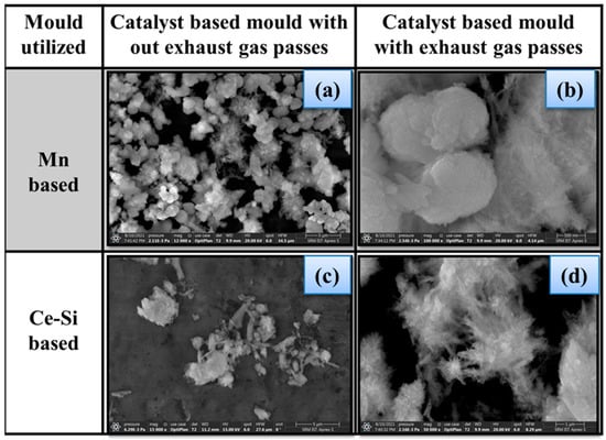 SEM analysis is carried out for both Ce-Si and Mn-based mold samples with and without exhaust gas pass, and the obtained morphologies are shown in Figure 7. Upon exposure to exhaust gas, the morphology changes to an irregular form, suggesting structural degradation due to catalytic reactions. The Ce-Si-based mold sample initially presents a flower-like morphology, which evolves into an irregular structure when exposed to exhaust gas, reflecting substantial catalytic activity and interaction with exhaust compounds [32].