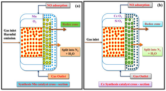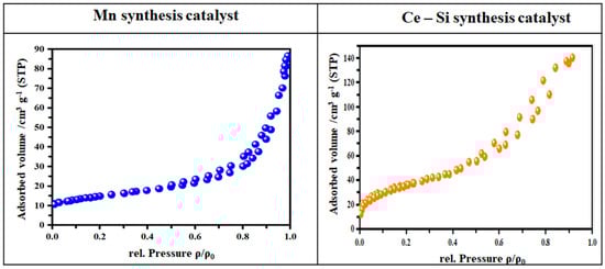 BET surface area measurements determined that the Ce-Si mold retained a high surface area capacity with even repeated thermal cycling achieving consistent catalytic performance at high exhaust temperatures, whereas the Mn-based mold achieved a performance with commendable thermal redox activity at low-to-moderate temperatures by forming Mn–O and Mn–OH bonds and also through the activation of the NO species, but The surface area and pore structure appeared to be less stable due to sintering upon prolonged thermal exposure, resulting in a gradual decrease in adsorption capacity and the availability of active sites [46,47].