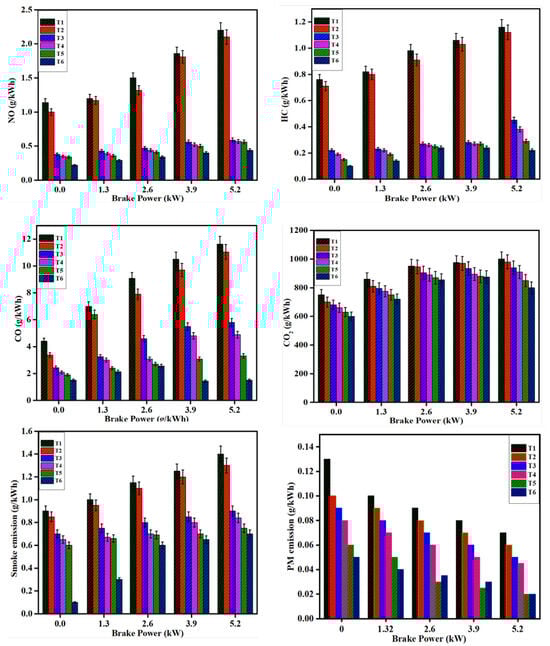 Exhaust emissions were investigated in diesel and DPB fuels utilized engines with Mn and Ce-Si-based molds under minimum and maximum load conditions, and the obtained readings are depicted in Figure 9. The Mn- and Ce-Si-based molds were evaluated for their effectiveness in reducing NO exhaust emissions. The Mn-based mold shows a lower pore structure and volume than the Ce-Si-based mold, which exhibits a higher pore structure and adsorption capacity. The Ce-Si-based mold is highly efficient for NO emission reduction [35]. Compared to trial T1, NO emissions are reduced by 66.67%, 69.29%, 70.17%, and 80.70% for trials T3 to T6, respectively, under minimum load conditions. The same is further reduced by 73.18%, 74.09%, 74.54%, and 80%, for trials T3 to T6 when compared with T1 under maximum load conditions.