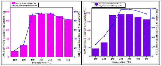 The reaction of NH3 with Mn and Ce-Si-based mold in examining NO conversion efficiency was investigated with the SCR technique, and the obtained results are depicted in Figure 10. The molds are utilized to perform efficiently under maximum load conditions. The exhaust manifold system has recently evolved to operate across a wider temperature range, leading to increased demand for Ce-Si-based molds, which are well-suited for such conditions. However, achieving high activity in the lower temperature range remains a challenge [36]. For instance, Mn-based mold, derived from salts, can react with SO2 present in exhaust gases to form MnSO4, which can poison the catalyst’s active sites. This issue contributes to the ongoing problem of catalyst deterioration. Moreover, the Mn-based mold is limited to a narrow temperature range, making it unsuitable for applications requiring versatility across varying temperatures. This limitation underscores the superiority of Ce-Si synthesized catalysts, which deliver outstanding performance and stability in challenging environments, particularly those involving high urea content treatments and elevated temperatures, where both efficiency and reliability are crucial. The Ce-Si-based mold maintains consistent activity across a broad temperature range of 150 to 600 °C [12,37,38]. At maximum load conditions, the Ce-Si catalyst mold achieves an 80% higher NO conversion efficiency compared to the Mn-based catalyst mold. Additionally, urea treatment significantly enhances the effectiveness of the Ce-Si mold, making it highly efficient in reducing NO emissions.