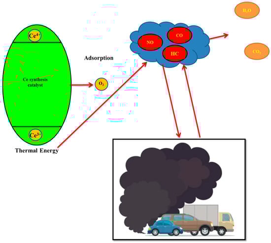 The Ce-Si catalyst tested in this work acts as a fairly efficient thermal catalyst for diesel engine exhaust emissions such as NO, HC, and CO. Cerium catalysts are well known to be great with oxygen storage and reversible redox properties Ce3+/Ce4+ that can assist oxidation and reduction reactions at normal exhaust temperatures [39], as shown in Figure 11.