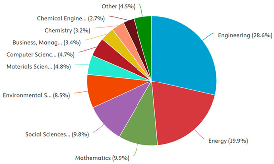 Engineering and energy subject areas have the highest number of documents, with 28.6% and 19.9% respectively, followed by mathematics, social sciences and environmental sciences.